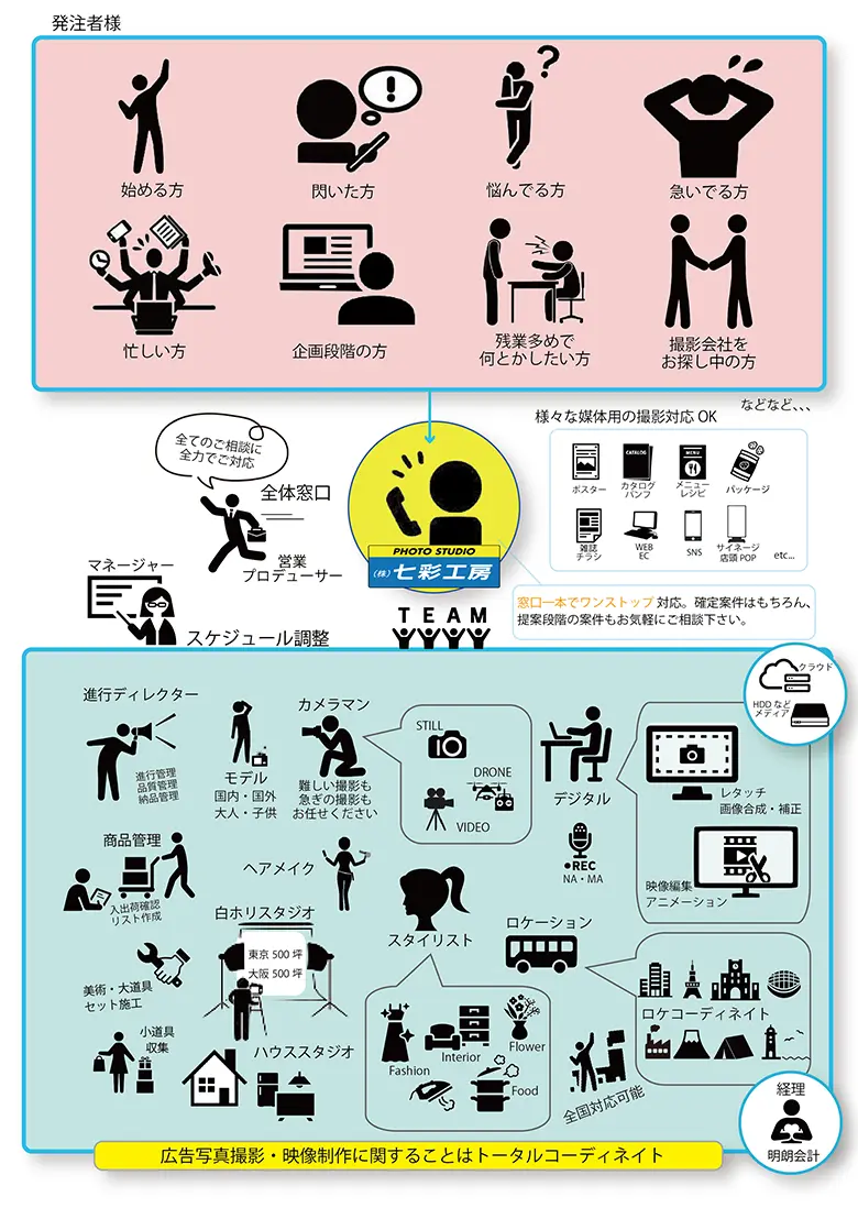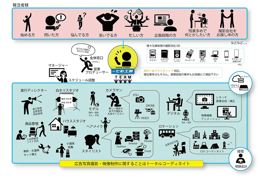 自社スタジオにスタイリスト、レタッチャー、ディレクターも在籍しているため、ブッキング、キャスティングから撮影、レタッチまでワンストップで対応します。